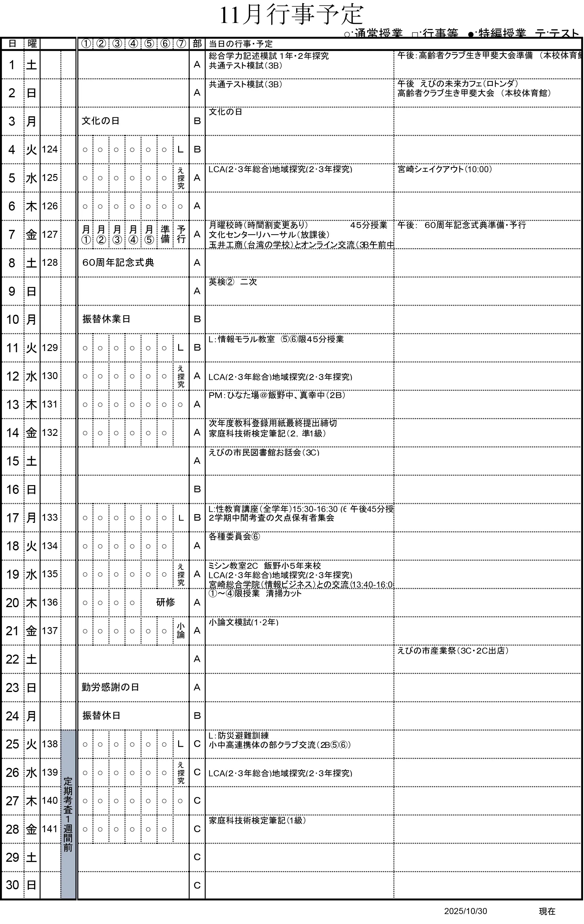 11月行事予定 2025-10-31 お知らせ Related Posts 12月行事予定 2025-10-31 第4回 学校運営協議会 議事録 2025-03-10 検索: 学校からのお知らせ お知らせ (3) 学校運営協議会 (1) 学校行事