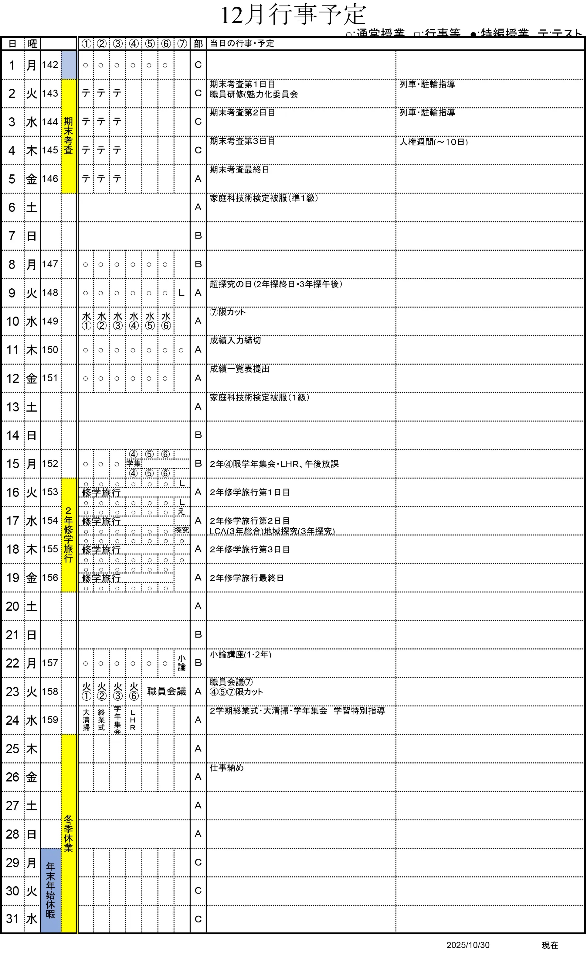 12月行事予定 2025-10-31 お知らせ Related Posts 11月行事予定 2025-10-31 第4回 学校運営協議会 議事録 2025-03-10 検索: 学校からのお知らせ お知らせ (3) 学校運営協議会 (1) 学校行事